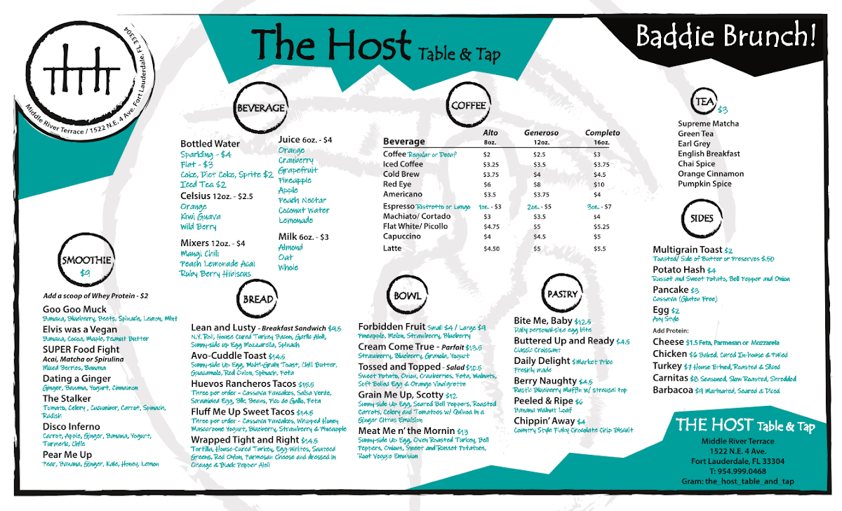 Welcome to The Host Table and Tap, a charming brunch destination nestled in Fort Lauderdale. This delightful eatery, located at 1522 NE 4th Ave, offers a cozy ambiance perfect for leisurely meals. The menu is a vibrant mix of comfort and creativity, highlighting dishes like the Lean and Lusty Breakfast Sandwich and AvoCuddle Toast that showcase fresh ingredients, all for an affordable price.